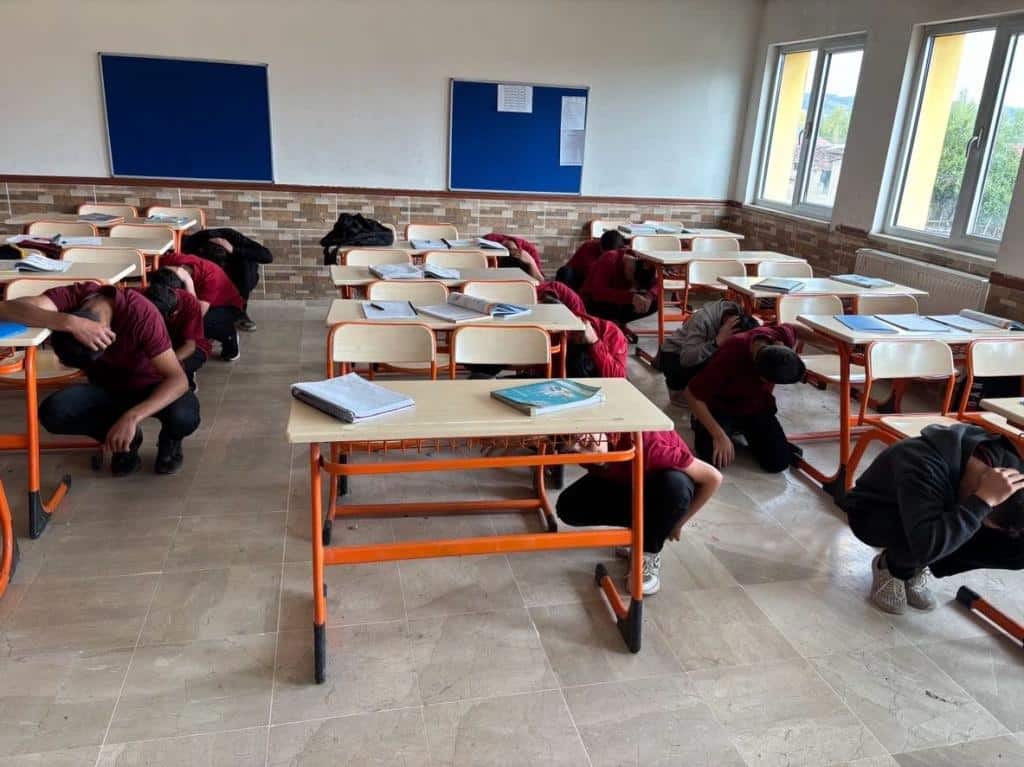 Çök-Kapan-Tutun: Sarsıntı anını temsilen verilen ilk alarmda öğrencilerimiz, bulundukları yerde hızla "Çök-Kapan-Tutun" pozisyonunu alarak kendilerini korumaya aldı.